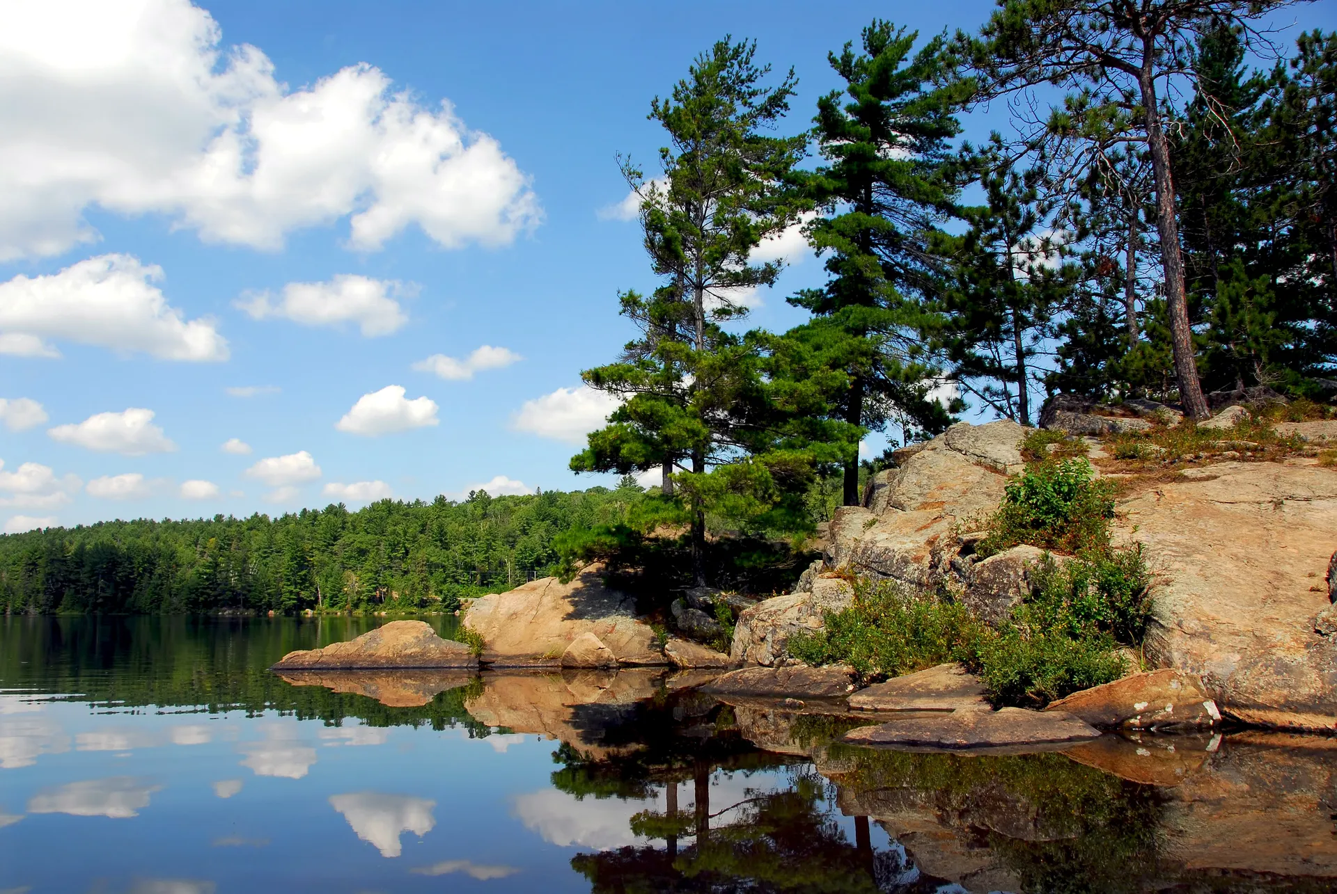 Aurore, assise à l’avant du canot, regarde le paysage qui défile devant elle. Certains des arbres, des pins, semblent pousser directement dans la roche. Leur réflexion dans l’eau claire est parfaite. Certains autres Conifères :arbres très communs dans le nord de l’Ontario, qui ont des aiguilles au lieu des feuilles et qui produisent des cônes et des cocottes pour se reproduire. semblent décoiffés par le vent, toutes leurs branches pointant dans le même sens.