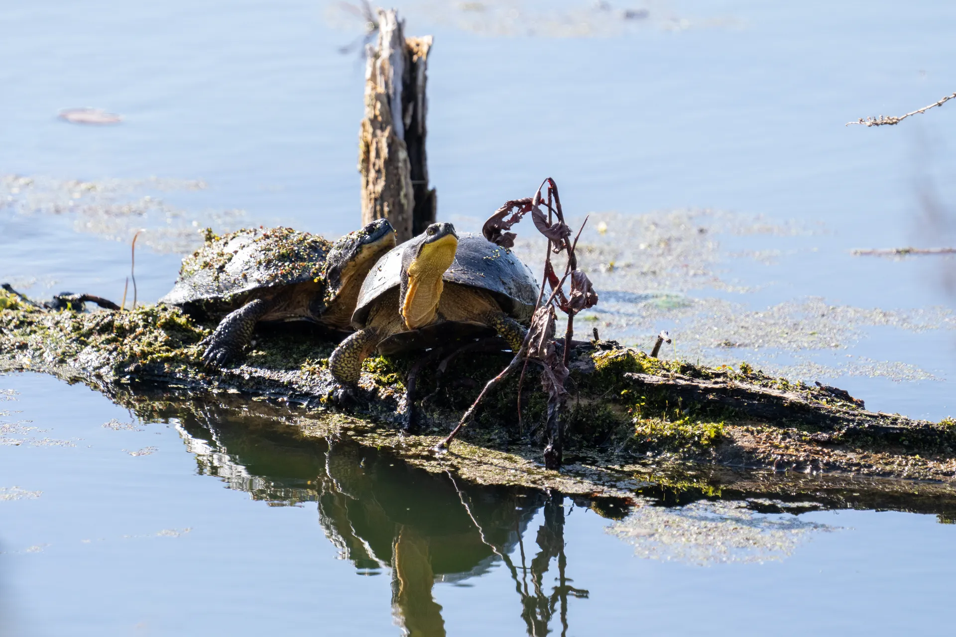 Les deux tortues mouchetées sont examinées et remises à l’eau. Heureusement, elles n’ont aucune blessure Apparente :que l’on peut voir. Aurore les regarde patauger et s’éloigner doucement de la rive.